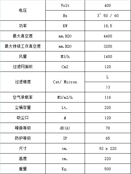 吸取的物質都將收集于帶輪子的集塵箱里(220升),從而可以方便安全處理被吸的物質。如果需要,可以直接收集到垃圾袋里。整個機器安放在堅固鋼鐵底盤上,帶兩個萬向輪,其中一個有制動裝置,所有金屬部件都是環氧噴漆的。