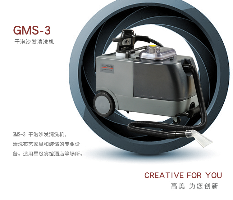 GMS-3干泡沙發(fā)清洗機,融入專利發(fā)泡技術(ZL032212437 ),泡沫制造,電動刷洗、真空抽吸三合一,是清洗各種布藝家具和裝飾的專業(yè)設備。配用清潔劑:干泡地毯水,地毯除漬劑,化泡劑。